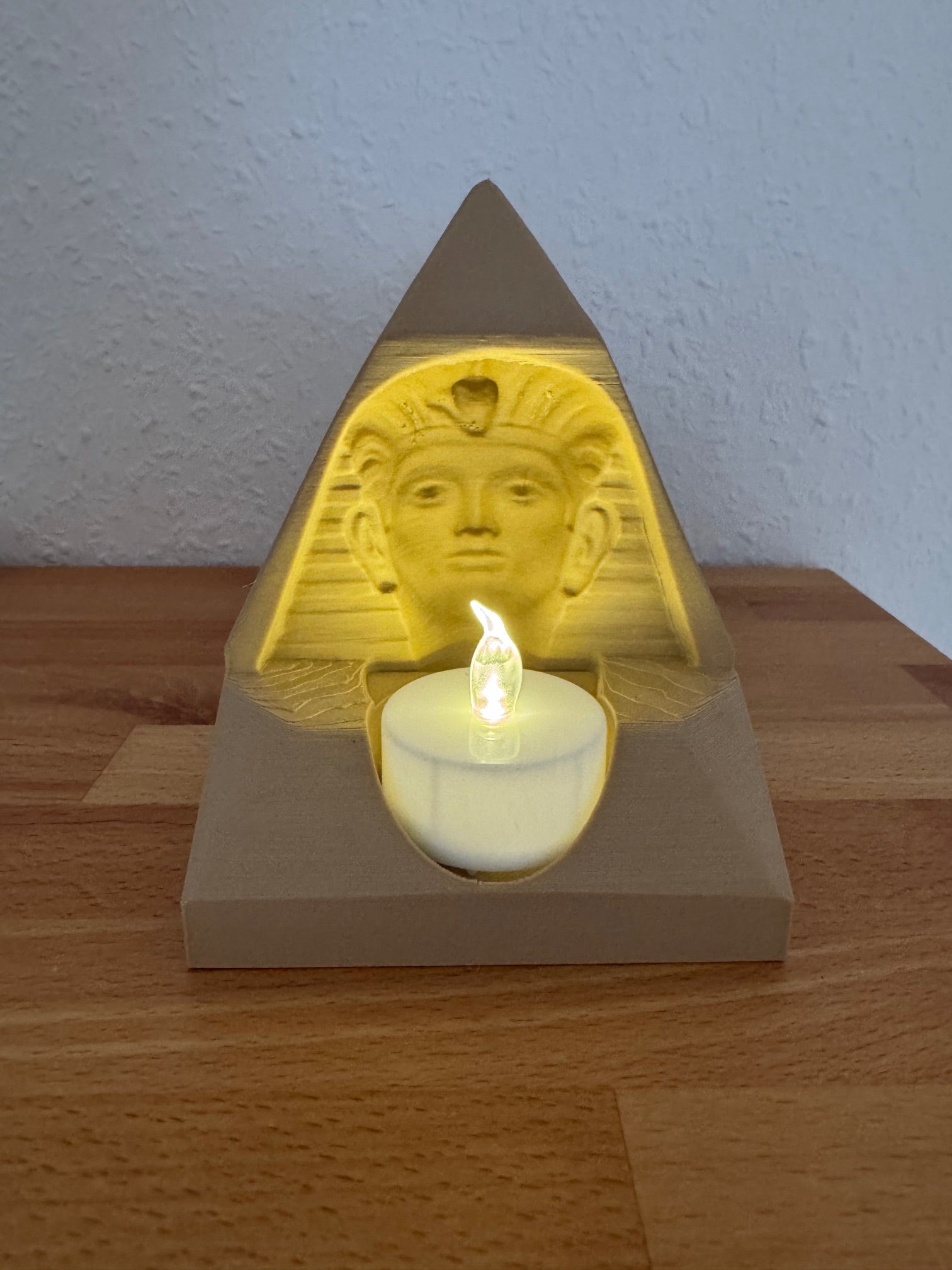 Antik Mısır firavun tasarımlı 3D efekt mum lambası. Piramit formunda, içten aydınlatmalı özel tasarım.