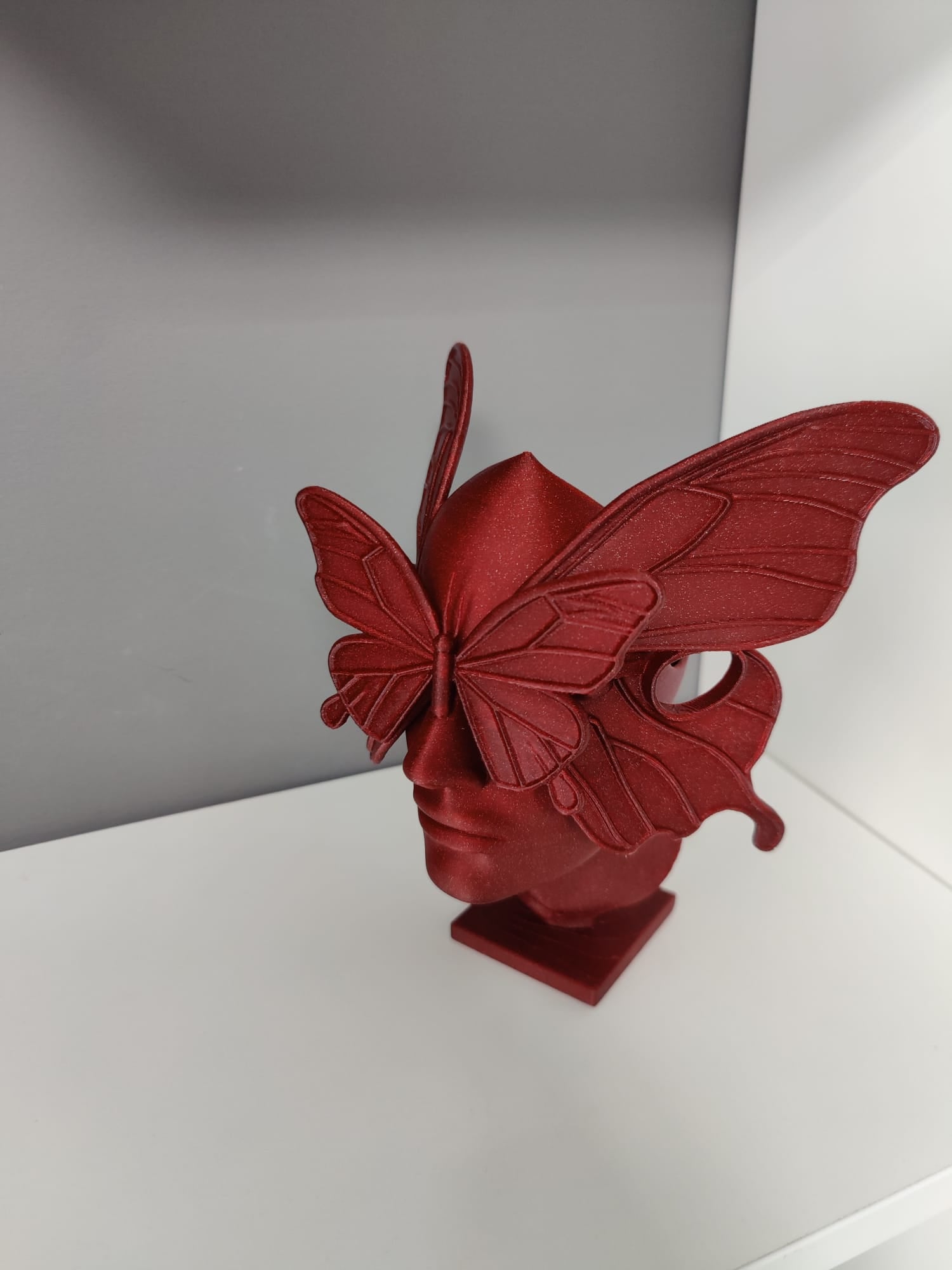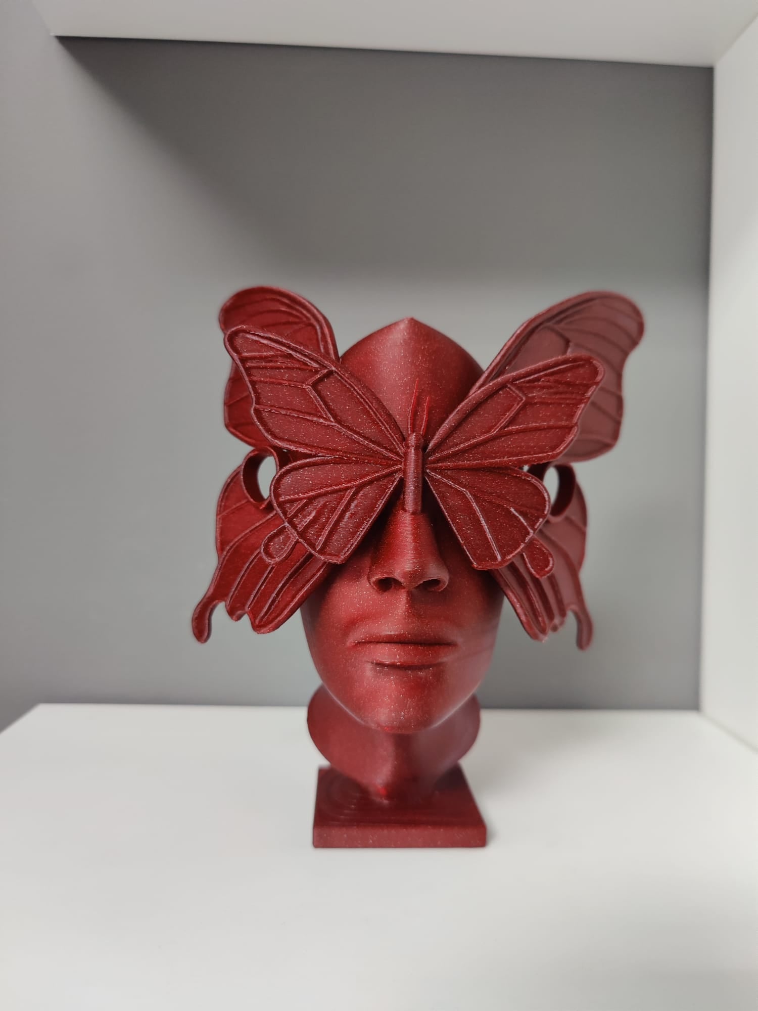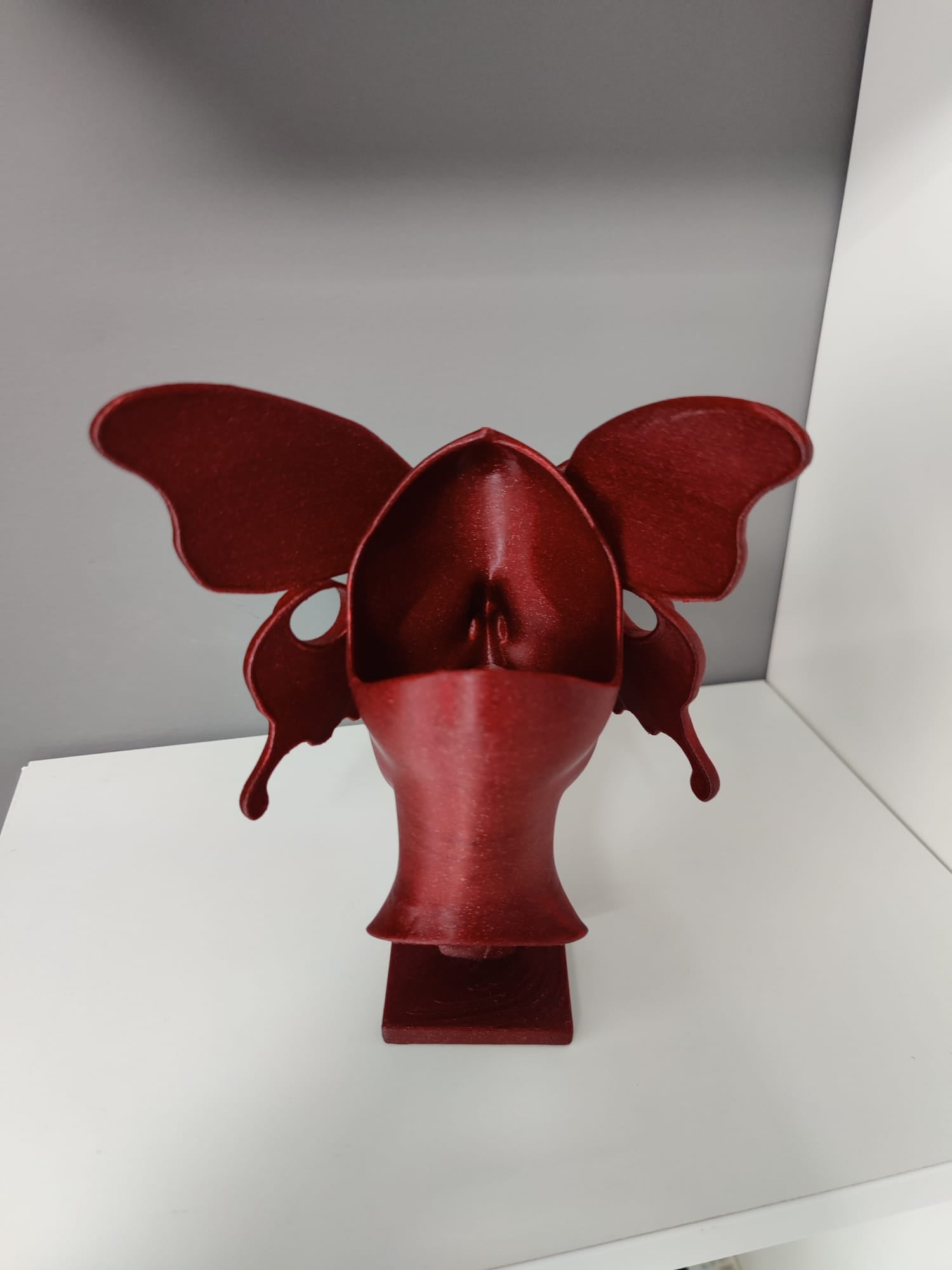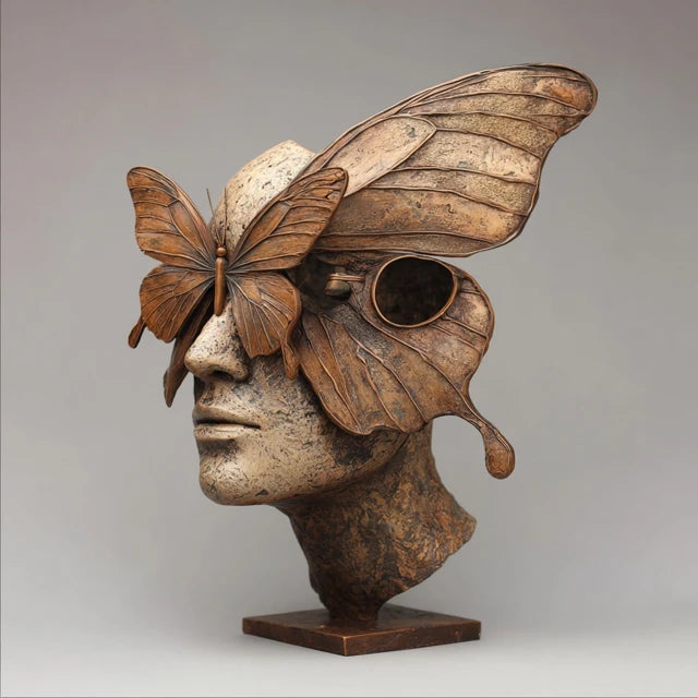 Kelebek ve insan figürünün birleştiği sürreal vazo heykeli. Özgünlük ve dönüşüm teması.