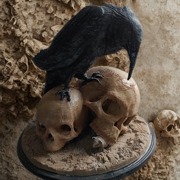 Gotik atmosferin büyüleyici yansıması olan bu diyorama, kuzgun ve kafataslarının dramatik birleşimini sunuyor. 25cm boyutunda PLA malzemeden üretilen bu sanat eseri, karanlık estetik seven koleksiyonerlerin favorisi. El boyaması ile her detayı özenle işlenmiş, mistik bir ambiyans yaratıyor.